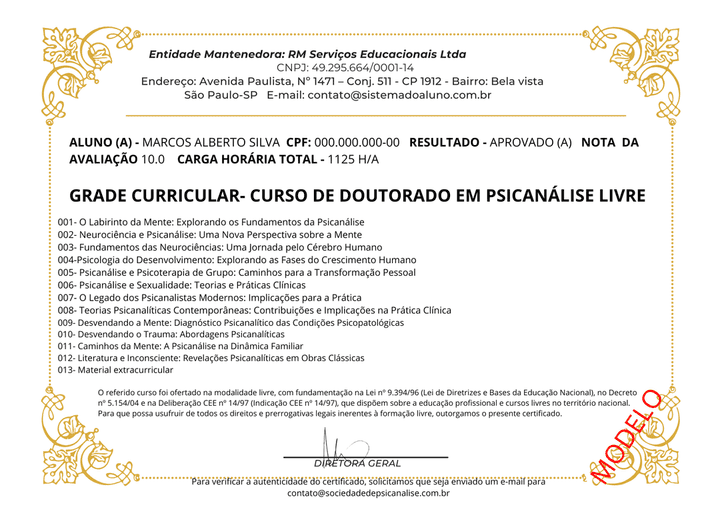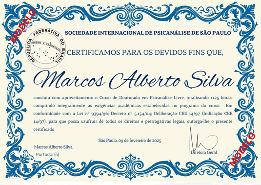 O Certificado de Doutorado em Psicanálise Livre atesta a conclusão bem-sucedida do programa do curso, reconhecendo a excelência demonstrada na formação avançada, na contribuição clínica e teórica ao campo da psicanálise. (Modelo da frente do certificado)